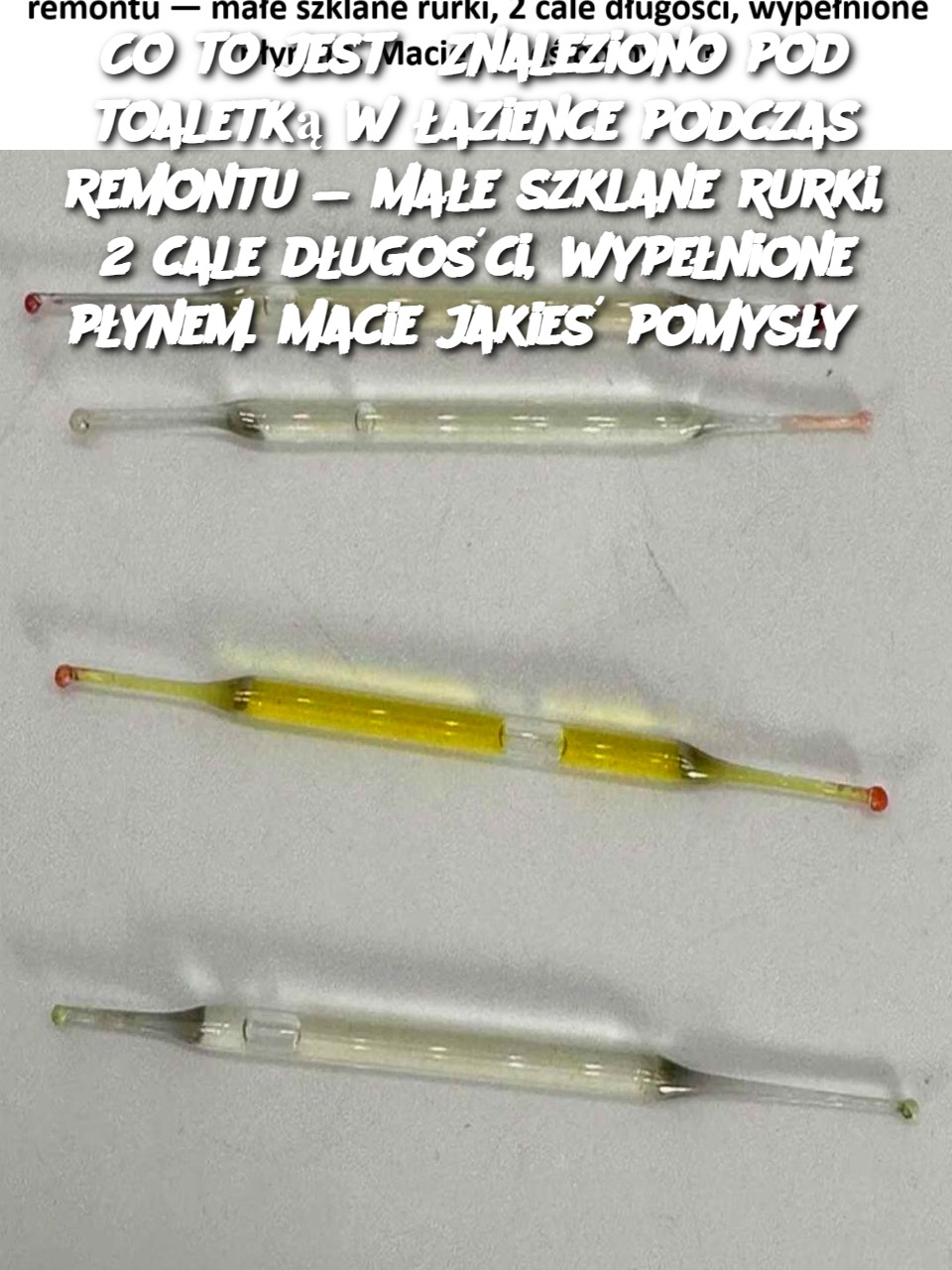 Co to jest? Znaleziono pod toaletką w łazience podczas remontu — małe szklane rurki, 2 cale długości, wypełnione płynem. Macie jakieś pomysły?